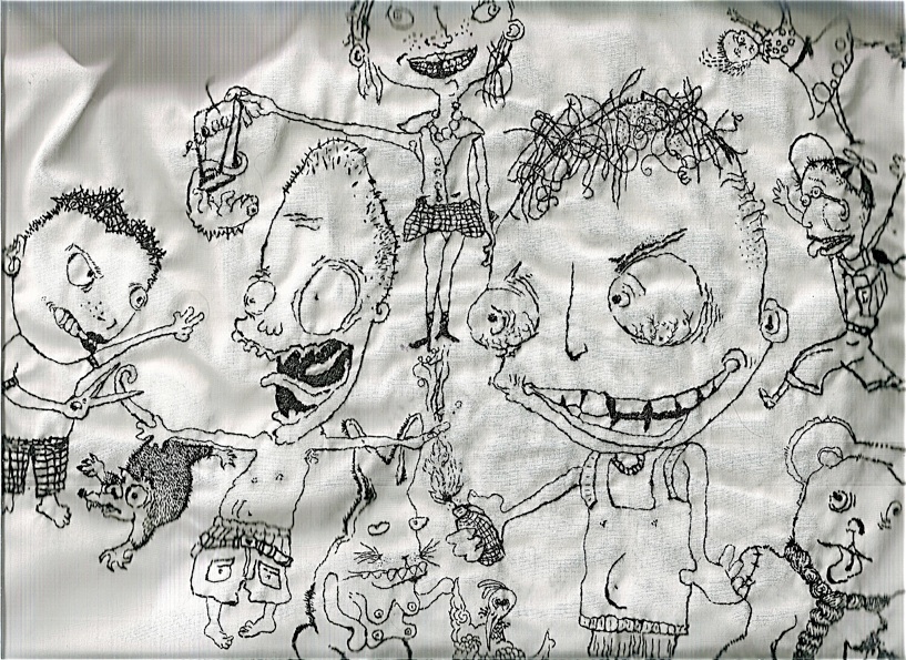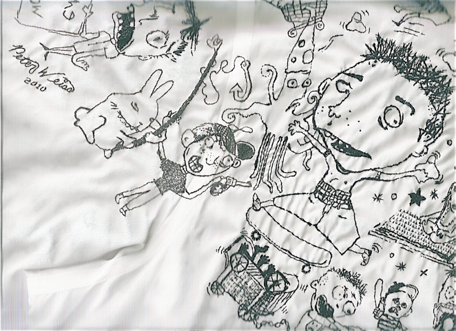 Fabric Art - Y Water inspired, “hand embroidered” cartoon characters on Brooks Brothers dress shirt